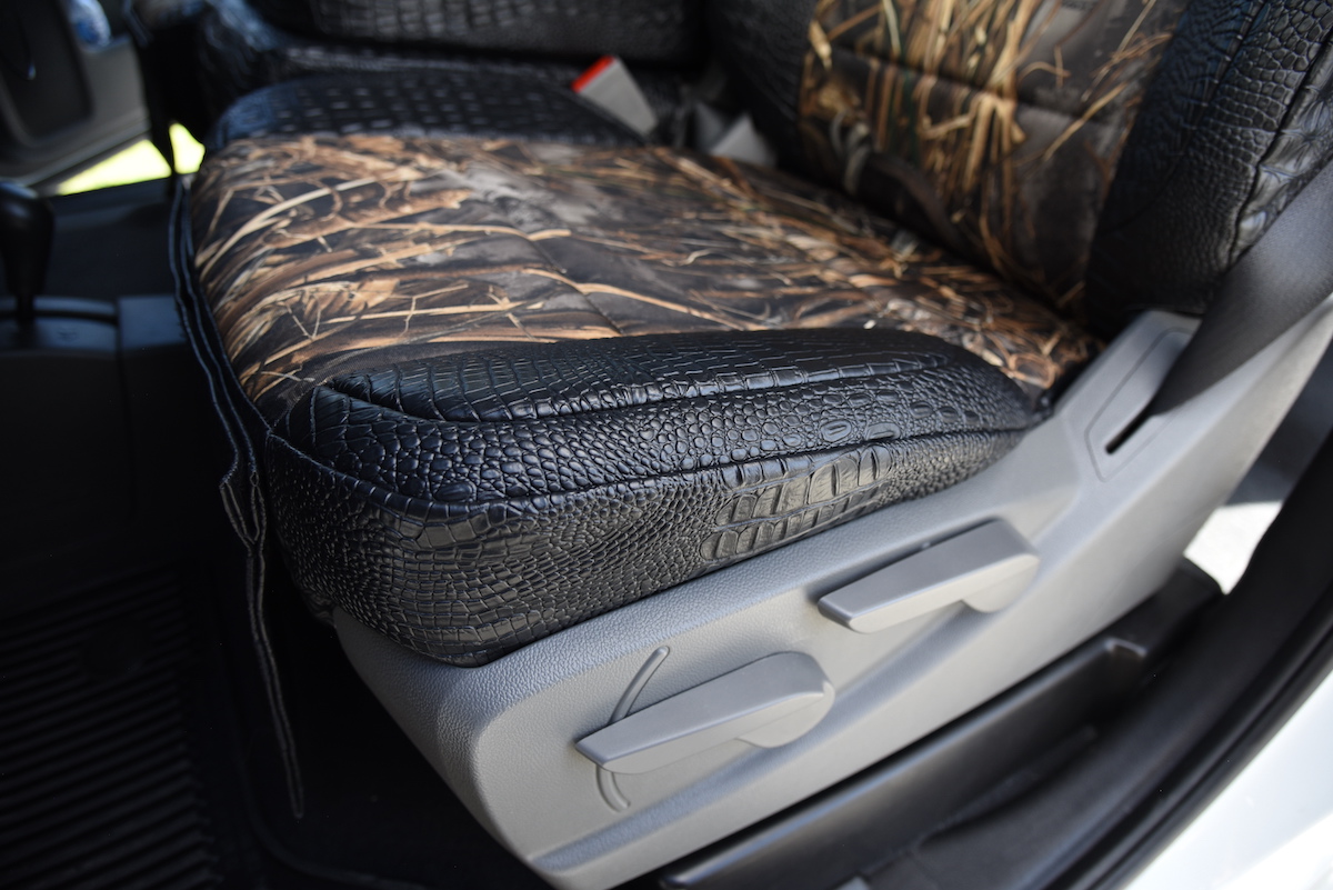 If you need to clean the seat covers then you can use a damp washcloth and some mild dish soap and they will clean up very easily. It is best not to use any alcohol based cleaning agents on the seat covers as this may cause the camo print to fade faster. You can have the Max-7 camo seat covers in a full camo pattern there both the insert and trim are made from the Max-7 pattern or you can have a two tone combo where you choose Max-7 for the insert or trim and another fabric for the insert or trim. Our main recommendation if you do this is to have the Max-7 pattern as the trim and then choose one of these patterns for the insert: Black Dura EZ-Care (600 denier nylon), Black Ostrich (simulated leather), or Black Sof-Touch (simulated leather). Black is a good fabric color to pair with the Max-7 since it already has some darker tones in it and the black doesn’t distract from the Max-7 pattern.